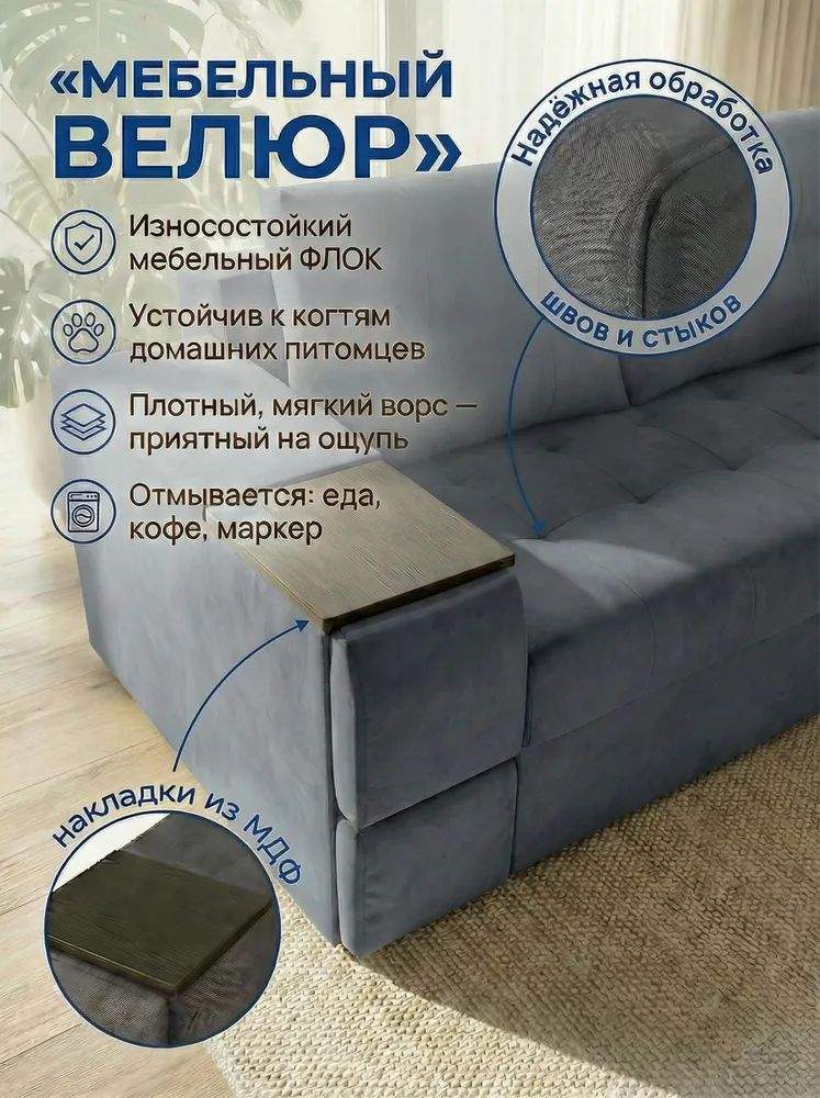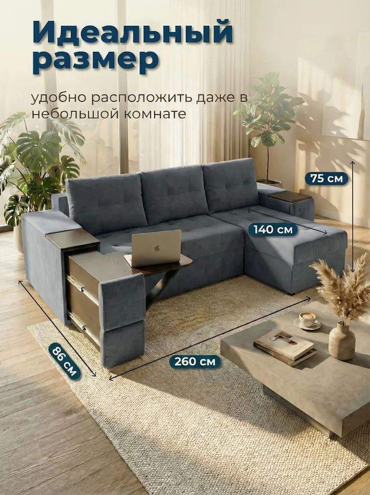 Элегантный угловой диван в современном скандинавском стиле станет центральным элементом вашей гостиной. Обивка из мягкого искусственного велюра придаёт интерьеру нежность и утончённость, гармонично сочетаясь с любыми оттенками стен и декора.