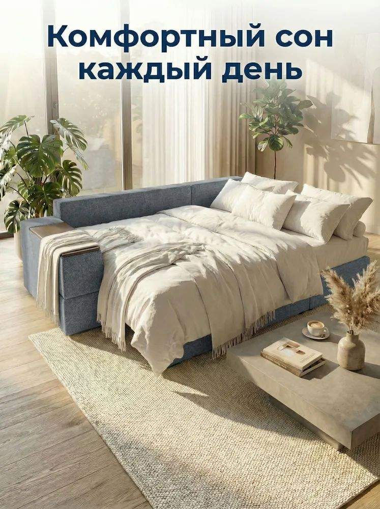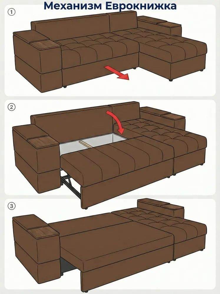Просторное сиденье с глубокими подушками и высокой спинкой создаёт комфортную зону отдыха, а механизм раскладывания «еврокнижка» превращает диван в удобное спальное место. Конструкция оснащена ящиками для хранения и встроенным столиком — идеально для организации пространства без потери стиля.