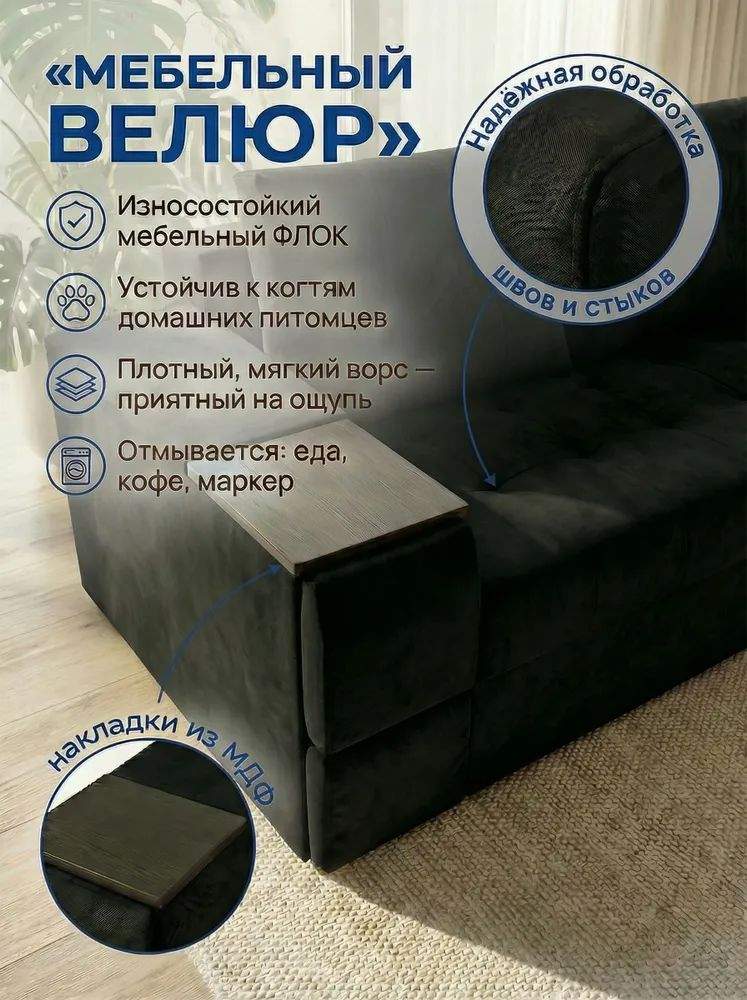 Элегантный угловой диван в современном скандинавском стиле станет центральным элементом вашей гостиной. Обивка из мягкого искусственного велюра придаёт интерьеру нежность и утончённость, гармонично сочетаясь с любыми оттенками стен и декора.