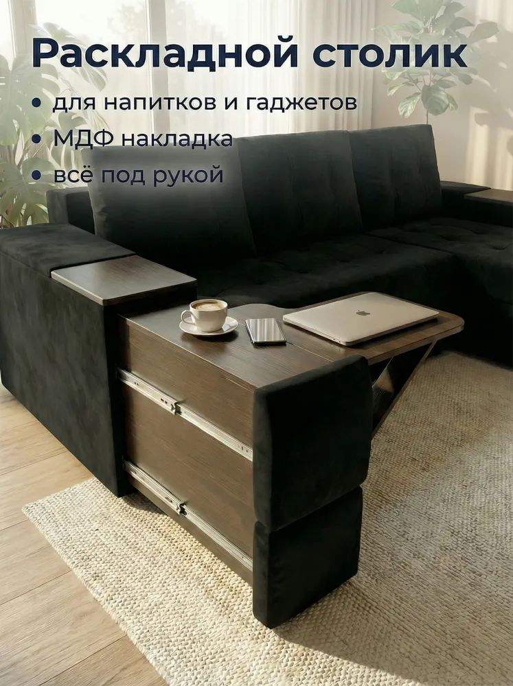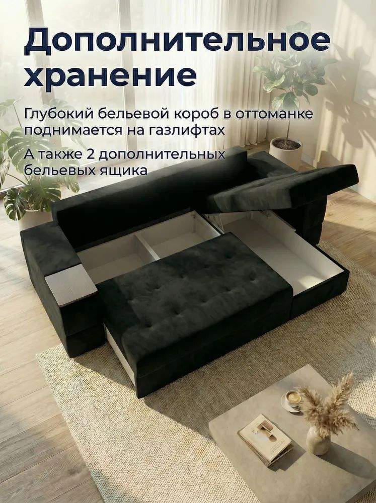 Просторное сиденье с глубокими подушками и высокой спинкой создаёт комфортную зону отдыха, а механизм раскладывания «еврокнижка» превращает диван в удобное спальное место. Конструкция оснащена ящиками для хранения и встроенным столиком — идеально для организации пространства без потери стиля.