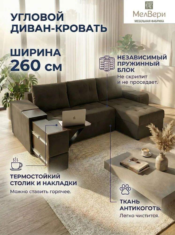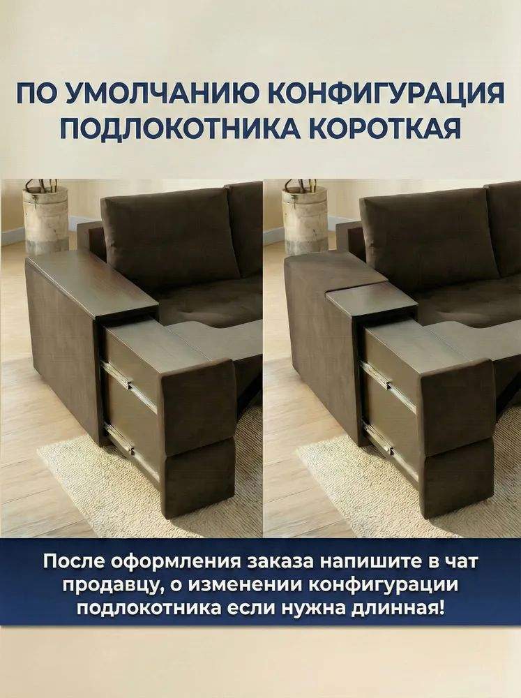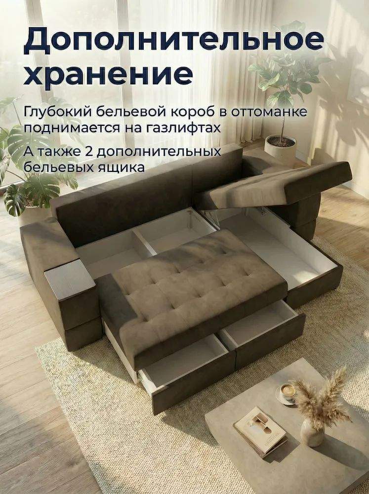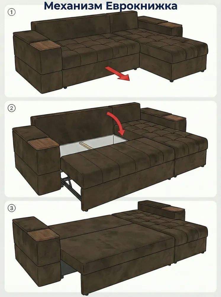 Просторное сиденье с глубокими подушками и высокой спинкой создаёт комфортную зону отдыха, а механизм раскладывания «еврокнижка» превращает диван в удобное спальное место. Конструкция оснащена ящиками для хранения и встроенным столиком — идеально для организации пространства без потери стиля.