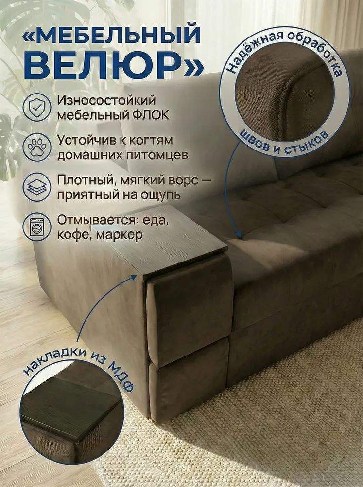 Элегантный угловой диван в современном скандинавском стиле станет центральным элементом вашей гостиной. Обивка из мягкого искусственного велюра придаёт интерьеру нежность и утончённость, гармонично сочетаясь с любыми оттенками стен и декора.