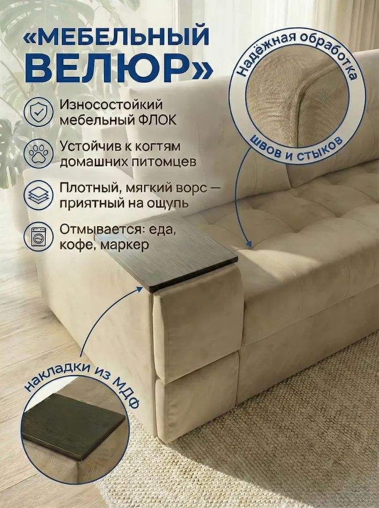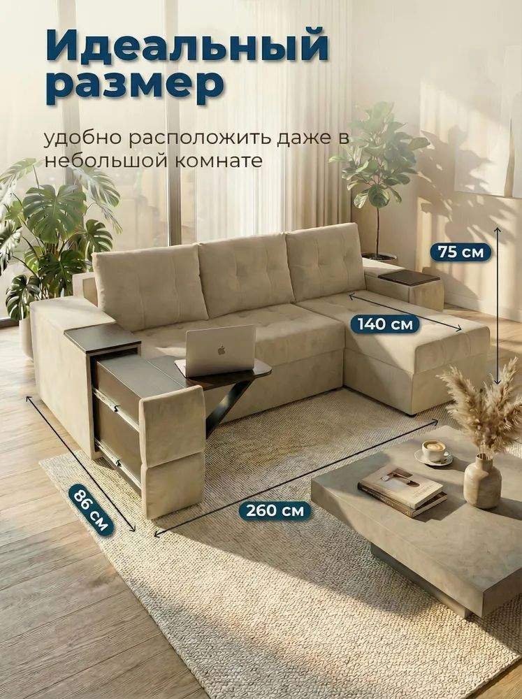 Элегантный угловой диван в современном скандинавском стиле станет центральным элементом вашей гостиной. Обивка из мягкого искусственного велюра придаёт интерьеру нежность и утончённость, гармонично сочетаясь с любыми оттенками стен и декора.