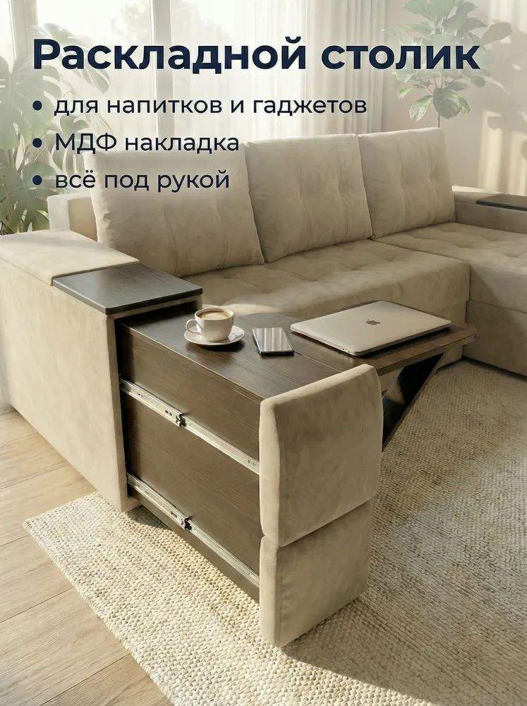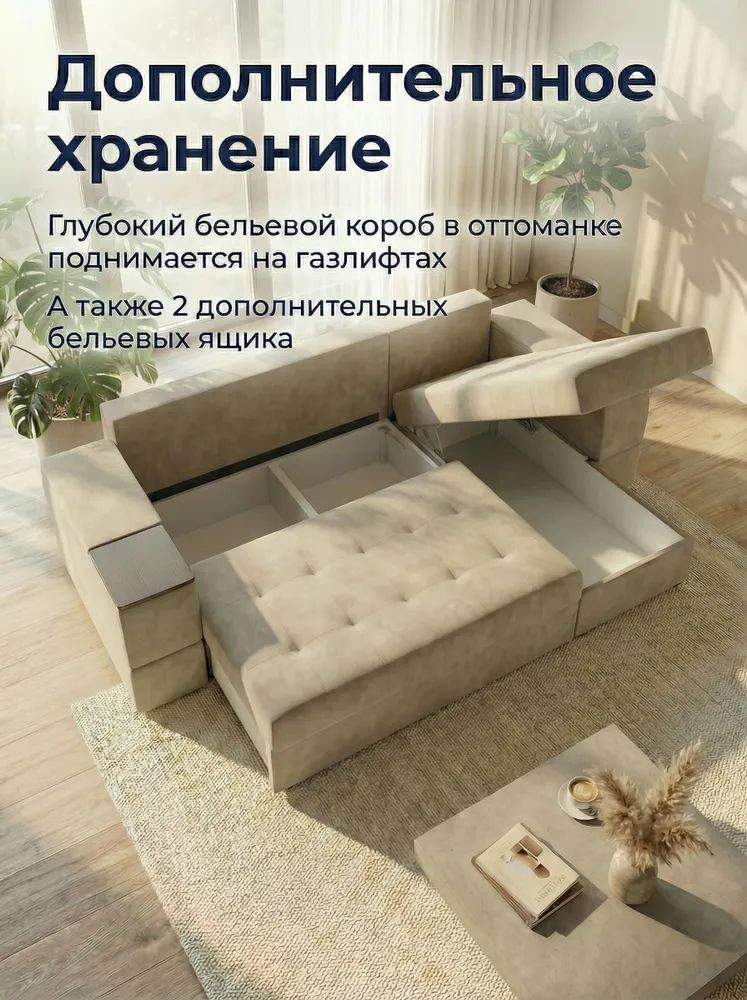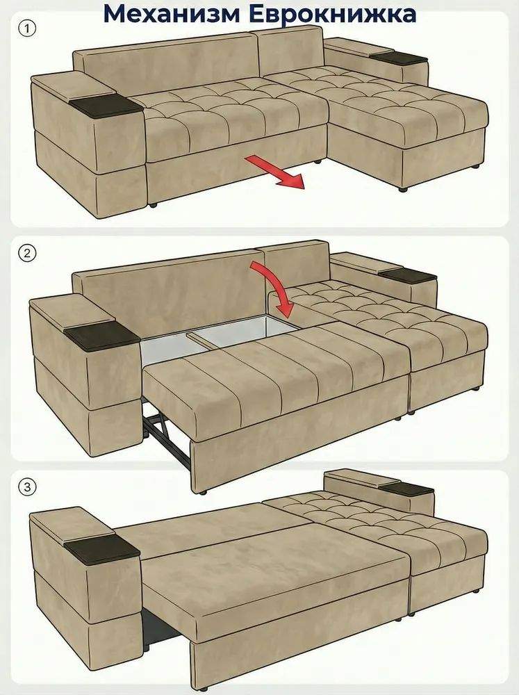 Просторное сиденье с глубокими подушками и высокой спинкой создаёт комфортную зону отдыха, а механизм раскладывания «еврокнижка» превращает диван в удобное спальное место. Конструкция оснащена ящиками для хранения и встроенным столиком — идеально для организации пространства без потери стиля.