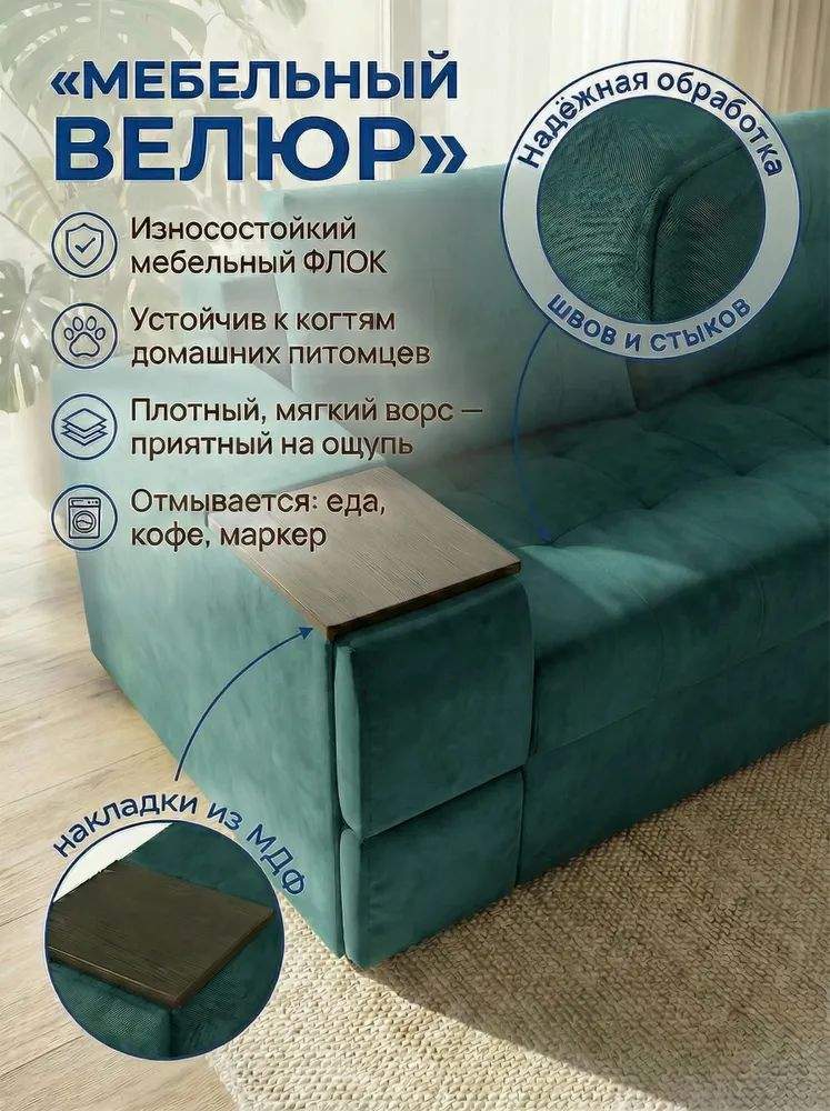 Элегантный угловой диван в современном скандинавском стиле станет центральным элементом вашей гостиной. Обивка из мягкого искусственного велюра придаёт интерьеру нежность и утончённость, гармонично сочетаясь с любыми оттенками стен и декора.