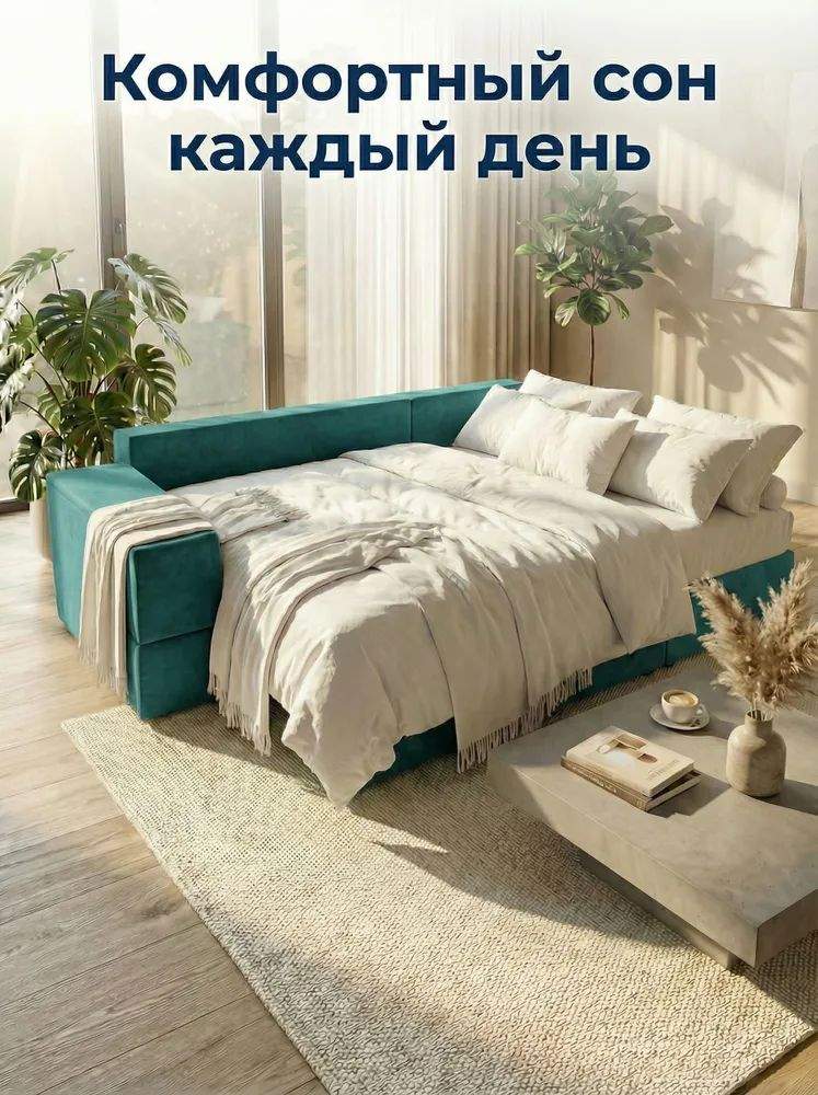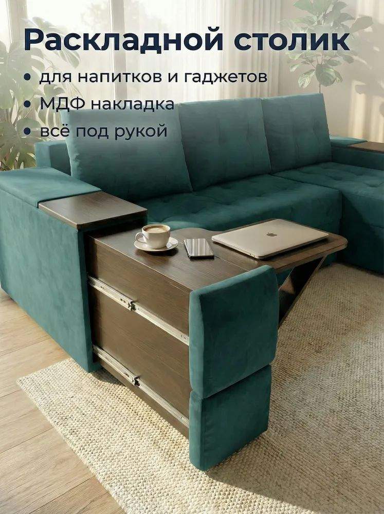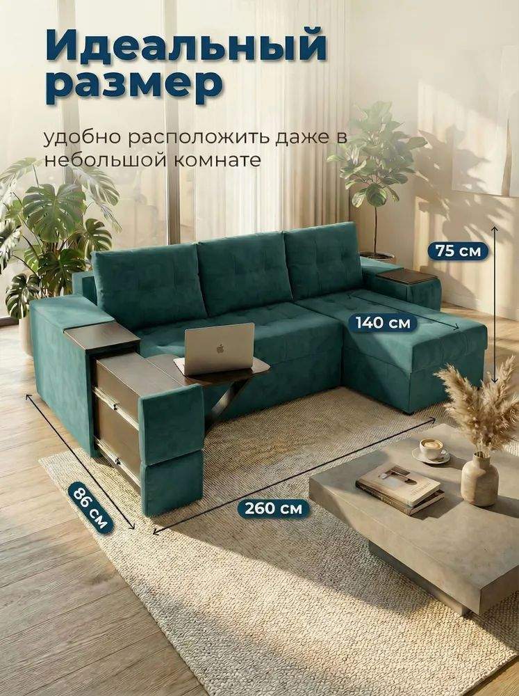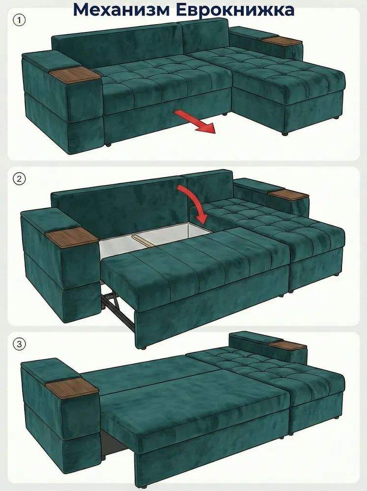 Просторное сиденье с глубокими подушками и высокой спинкой создаёт комфортную зону отдыха, а механизм раскладывания «еврокнижка» превращает диван в удобное спальное место. Конструкция оснащена ящиками для хранения и встроенным столиком — идеально для организации пространства без потери стиля.